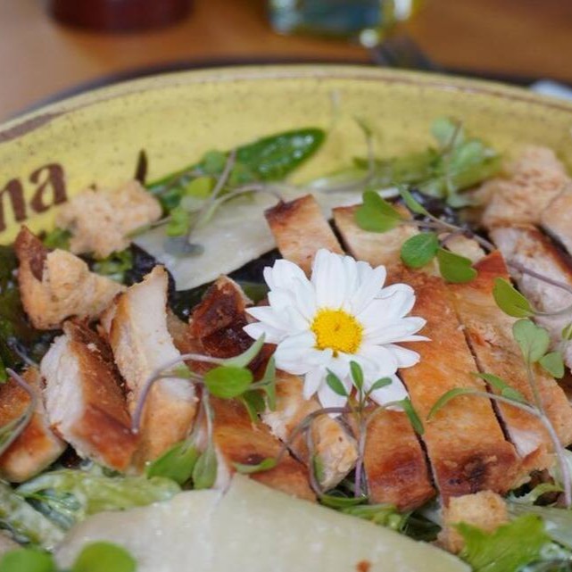 Mix de folhas da estação, frango grelhado (120g), croutons e molho caesar da casa.