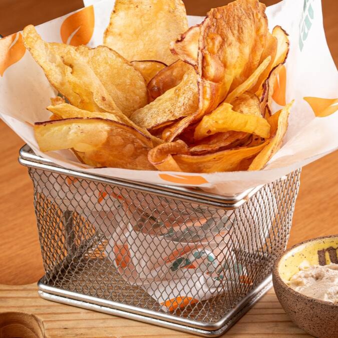 Chips artesanal feito com um mix de raízes e servido com nosso maravilhoso queijo vegano cremoso.