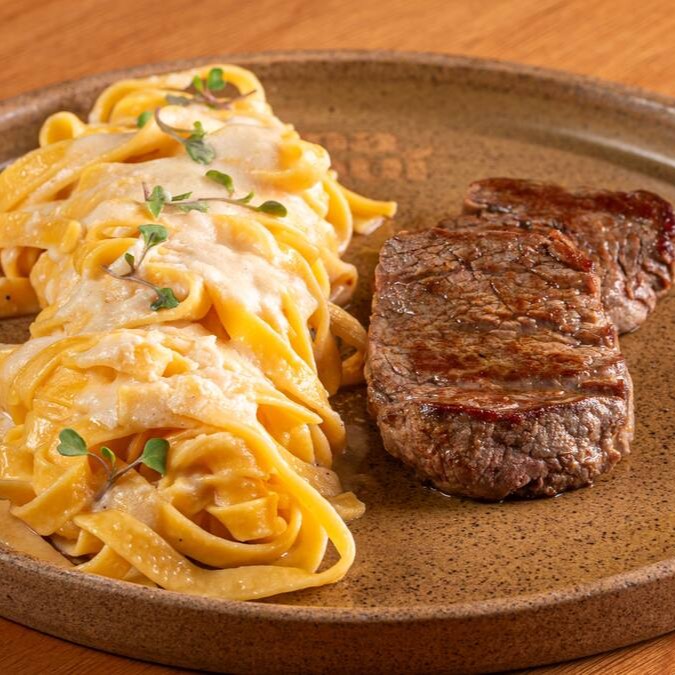 Talharim artesanal, molho bechamel a base de castanhas com seleção de queijos, acompanhado de um suculento medalhão de mignon grelhado. Acompanha mini salada temperada com nosso vinagrete de manjericão (entrada). Contém glúten / Contém Lactose.