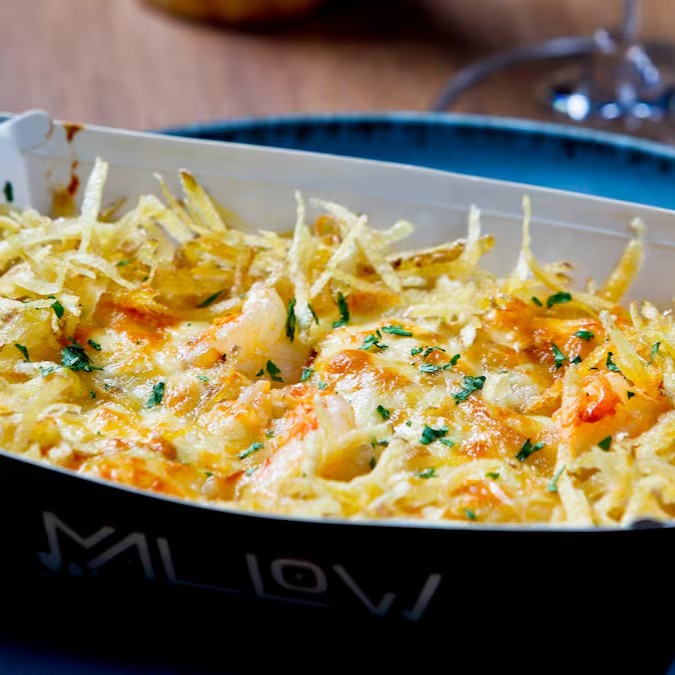 Nosso Camarão Internacional é uma deliciosa combinação de camarões suculentos com um cremoso molho de queijo, arroz cremoso e batata allumette crocante por cima, que adiciona uma textura irresistível ao prato. Uma escolha perfeita para quem busca um toque especial e sofisticado!