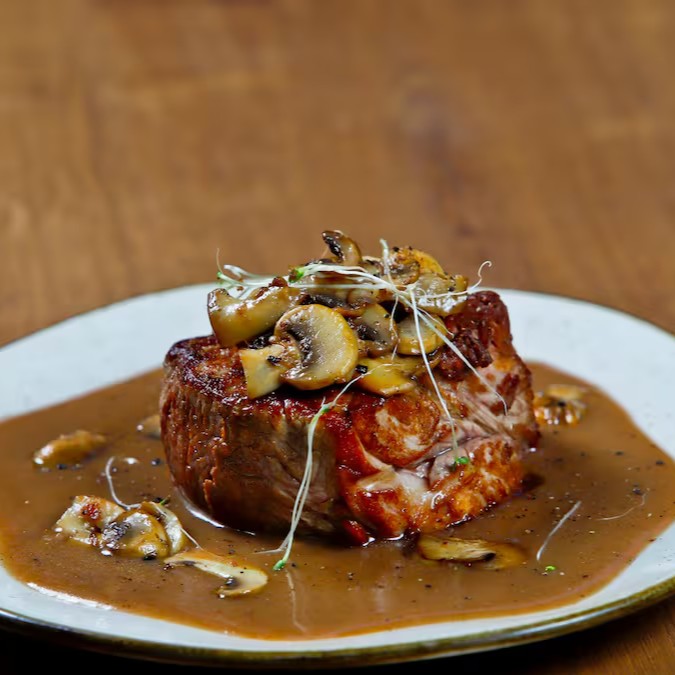 Suculento filé de mignon coberto com molho madeira, acompanhado de um arroz de alho-poró. Uma combinação perfeita para uma refeição deliciosa e refinada.