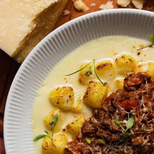 Gnocchi ao molho de queijo e acompanha um ragu de carne que é delicioso