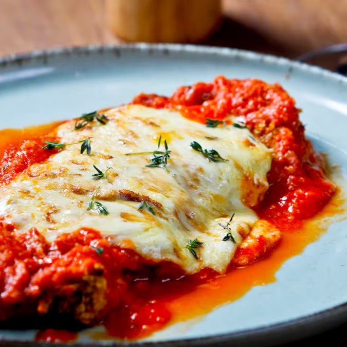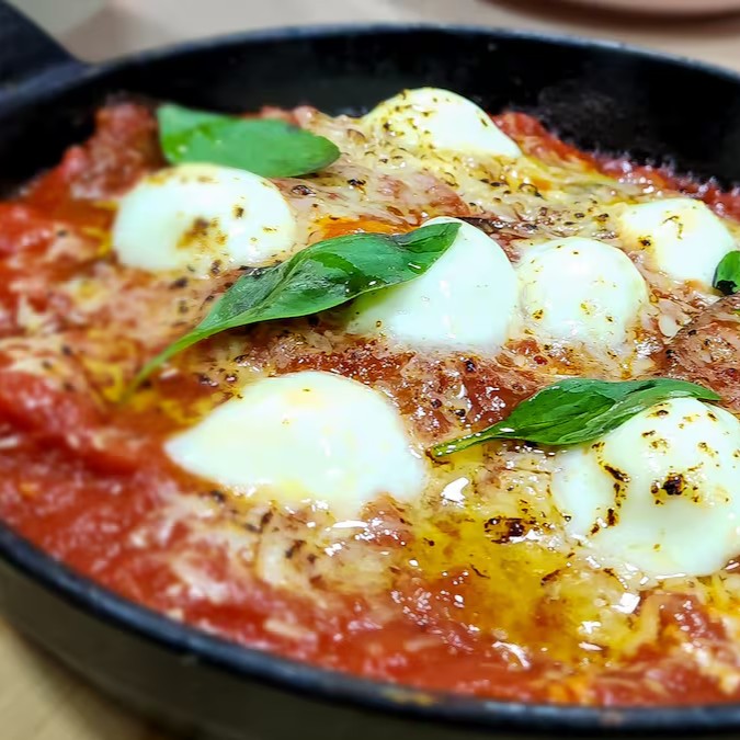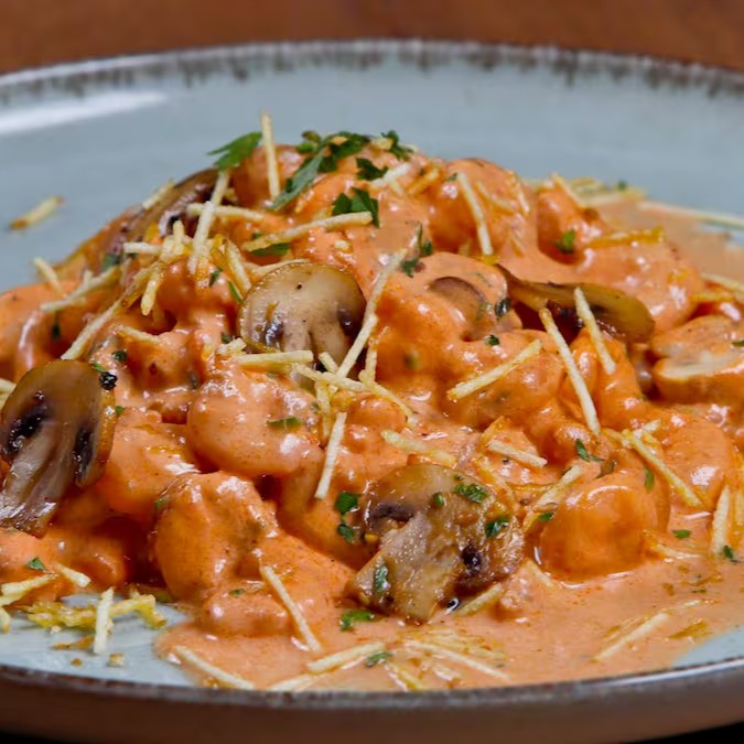Gnocchi de batata macio, servido em um molho de tomate caseiro com manjericão e mozzarella de búfala, gratinado no forno até ficar levemente dourado.