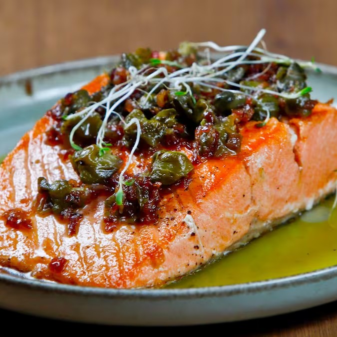 Salmão grelhado com crosta dourada, finalizado com alcaparras frescas que trazem um toque salgado e sofisticado. Acompanha arroz branco soltinho, para uma refeição leve e saborosa.