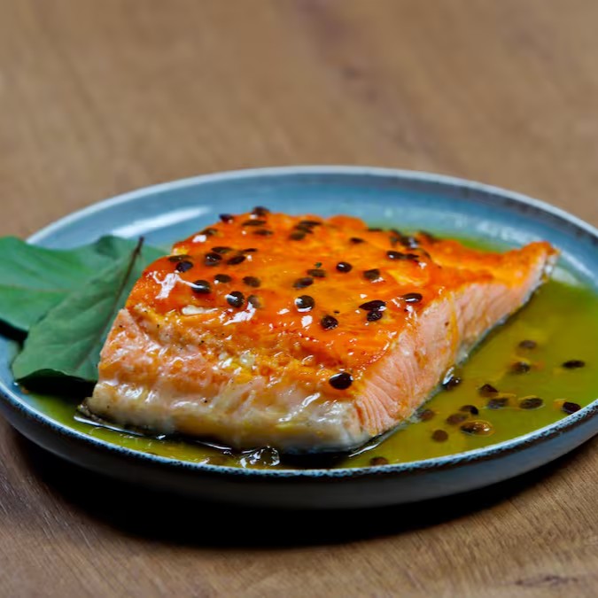 Salmão grelhado ao ponto perfeito, coberto com um suave e levemente ácido molho de maracujá, que realça o sabor do peixe. Acompanha batatas ao murro, proporcionando uma refeição deliciosa e equilibrada