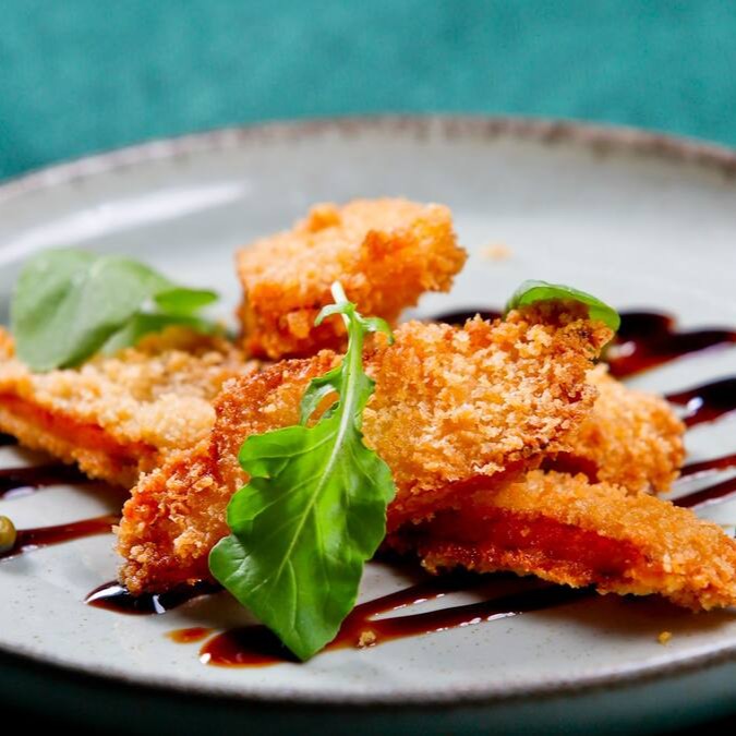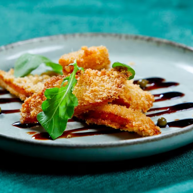 Filé mignon batido, empanado com farinha Panko e frito.