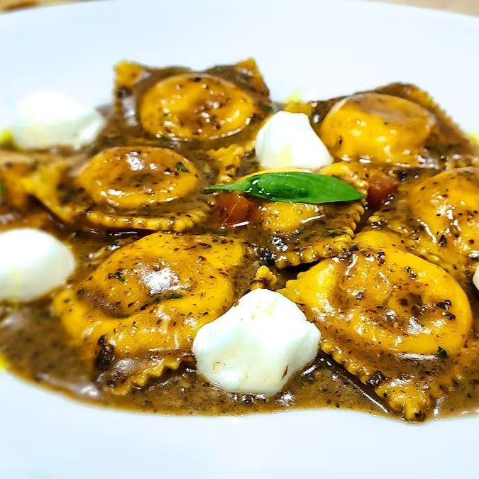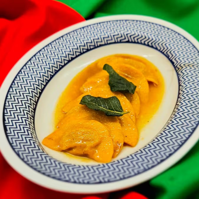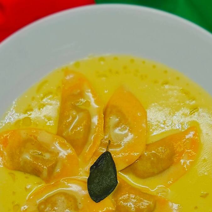 Massa leve e delicada, feita com os melhores ingredientes, envolvendo um recheio cremoso de abóbora fresca, temperada com ervas aromáticas e molho alfredo.