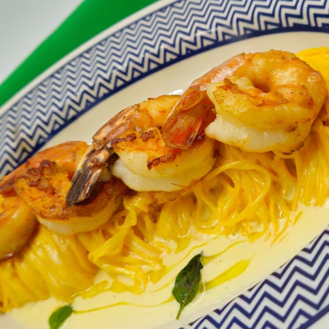 Camarões grandes grelhados com Taglioline e molho de limão: uma deliciosa combinação da culinária italiana, onde sabores frescos e cremosos se unem para criar uma experiência gastronômica única.