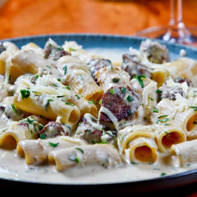 Massa rigatoni no ponto certo, com pedaços generosos de mignon super macios, envolvidos em um molho cremoso cheio de sabor. Finalizado com um toque de ervas frescas e parmesão ralado!