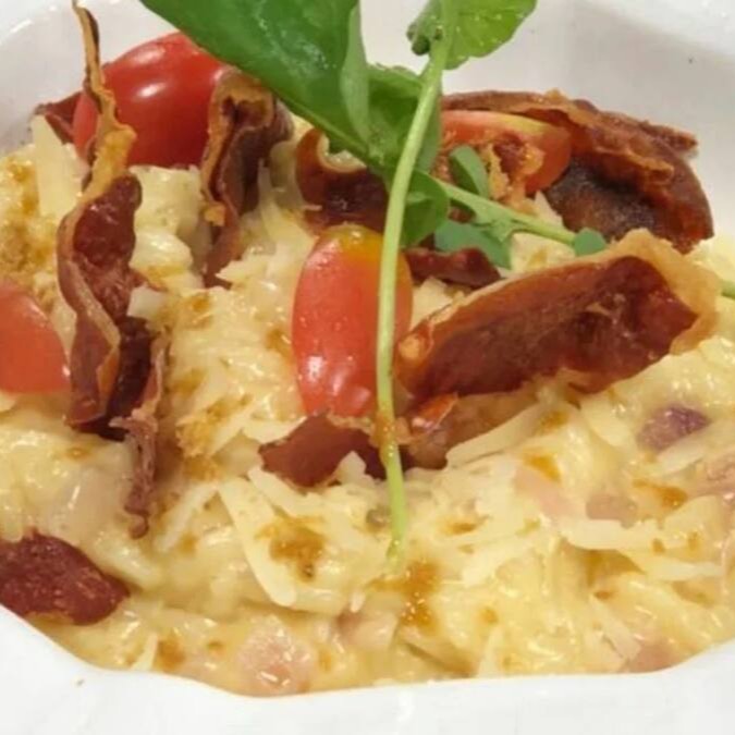 Arroz arbóreo cremoso, enriquecido com o sabor marcante do parmesão e finalizado com fatias finas de presunto de Parma, trazendo uma combinação clássica e sofisticada que encanta o paladar.