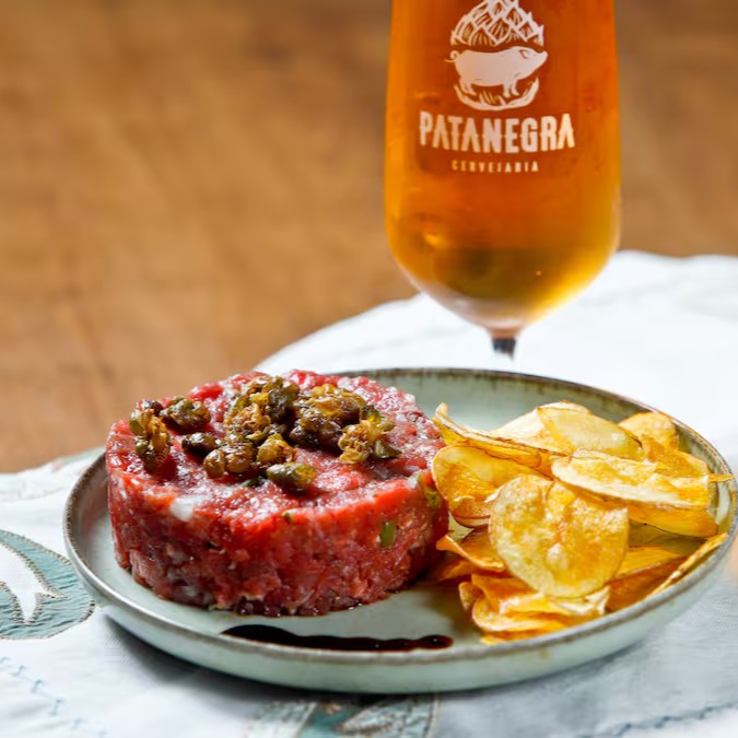 Tartare de mignon fresco, temperado cebola roxa, alcaparra, cebolinha, mostarda, azeite, sal e pimenta e servido com chips crocantes de batata. Uma opção leve e cheia de sabor, perfeita para abrir o apetite ou compartilhar!