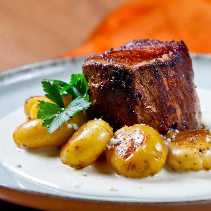 Medalhão de mignon grelhado e coberto com molho cremoso de gorgonzola, acompanhado de batatas ao murro douradinhas. Uma combinação deliciosa pra quem ama sabor marcante e carne macia!