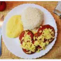 Deliciosa beringela à parmegiana, com molho de tomate artesanal e muuito queijo mussarela por cima. Acompanha arroz e purê de batatas.