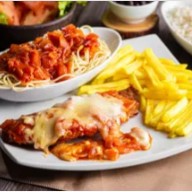 Maravilhoso filé de frango à Parmegiana dos deuses, não tem como comer só uma vez. Feito com molho de tomate artesanal e muito queijo mussarela por cima. Acompanha arroz branco quentinho e purê de batatas.