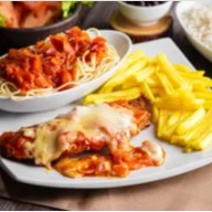 Deliciosa parmegiana de bife preparado com ingredientes selecionados. Felicidade em forma de refeição, muito elogiado pelos clientes. Acompanha arroz e purê de batatas.