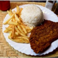 Delicioso filé de peixe à milanesa, acompanhado de arroz branco, feijão e um acompanhamento à sua escolha. 😋