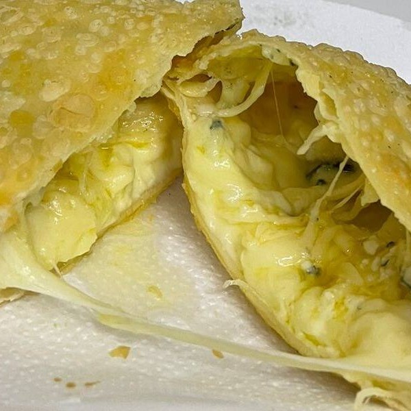 Uma combinação irresistível de queijos : mussarela , gorgonzola , provolone e parmesão derretidos , envolta em uma massa crocante e dourada.