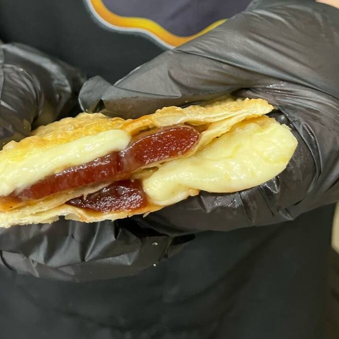 Pastelzão de 20 cm, recheado com queijo cremoso e goiabada docinha, derretida na medida certa!