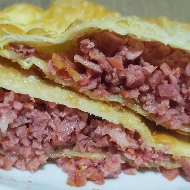 Pastelzão de 20 cm, recheado com calabresa refogada no ponto certo e requeijão cremoso derretendo no recheio!