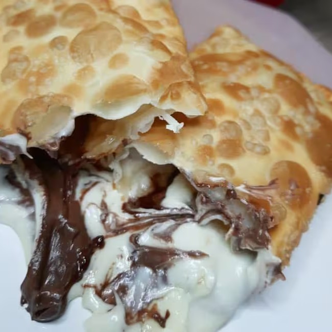 Pastel doce de 20cm, recheado com chocolate ao leite cremoso e chocolate branco suave e aveludado. Casquinha crocante e uma explosão de sabor que derrete na boca. Ideal pra quem ama os dois e não quer escolher!