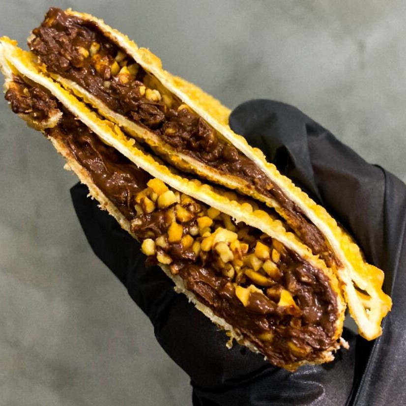 Pastelzão de 20 cm, recheado com chocolate ao leite cremoso e intenso, derretendo na medida certa!
