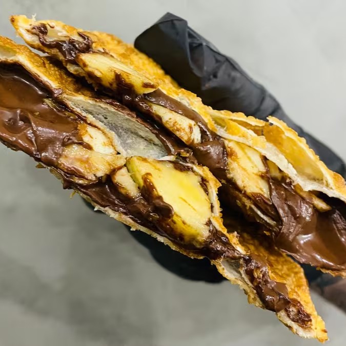 Pastelzão de 20 cm, recheado com banana fresquinha, coco ralado suave e chocolate derretido no ponto certo!