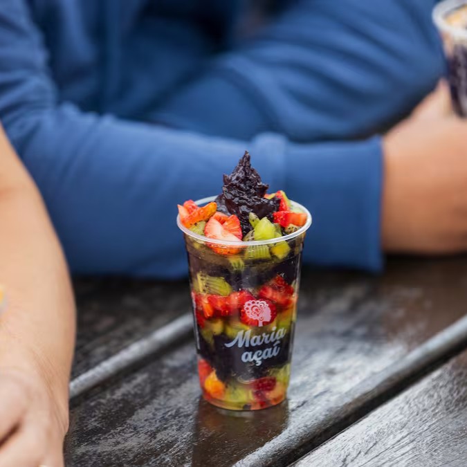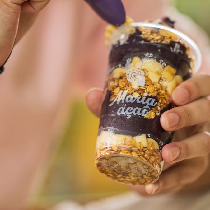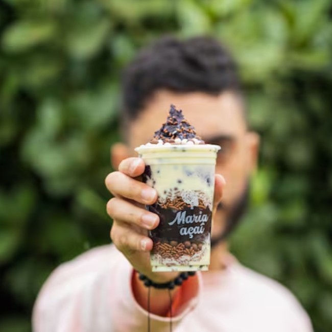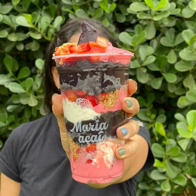 Copo M (400ml) de açaí artesanal Maria Açaí batido na hora (receita exclusiva) + 4 opções de acompanhamentos (escolha considerando a lista pré-estabelecida no cardápio). O copo irá tampado, e lacrado com os acompanhamentos em três partes: fundo, meio e topo. Não enviamos acompanhamentos separados. Acompanhamentos não são vendidos separadamente. Imagem ilustrativa.