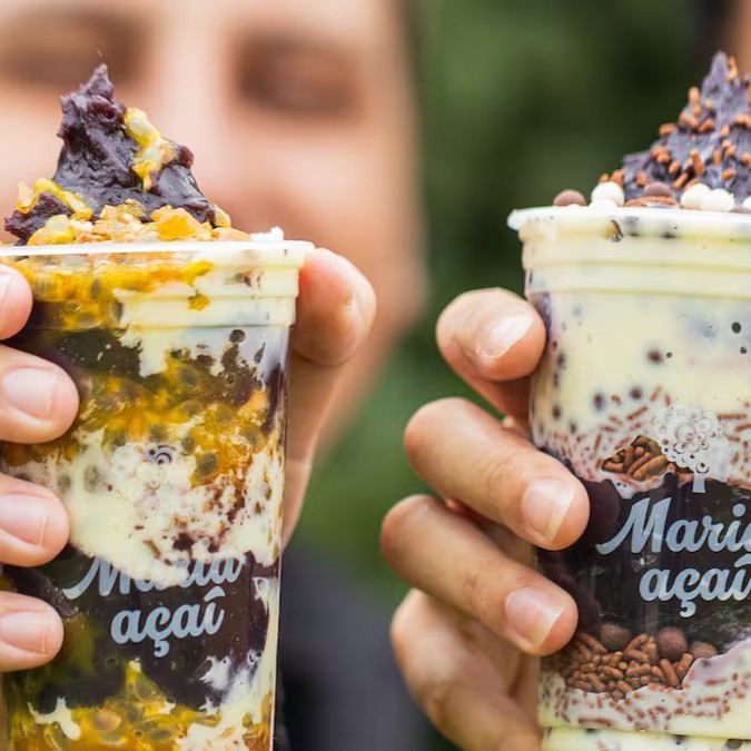 Dois copos P (300ml). Açaí batido na hora da Maria açaí + banana e granola. Os copos irão tampados com os acompanhamentos em três camadas: Fundo, meio e topo. Não enviamos os acompanhamentos separados. A promoção considera o preço dos acompanhamentos pagos individualmente. A montagem do copo não pode ser alterada e os acompanhamentos não podem ser excluídos. Imagens ilustrativas.