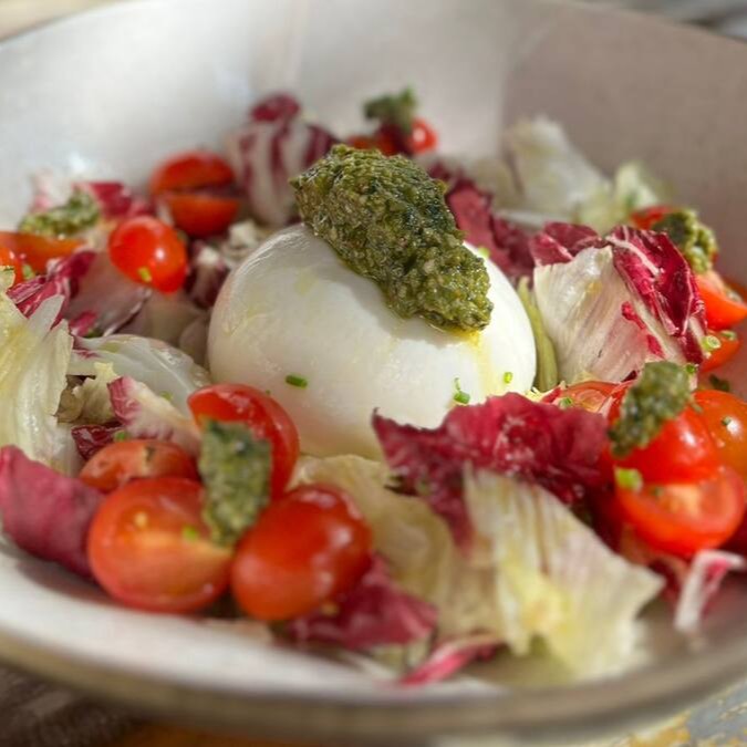Mergulhe na tadição italiana com nossa Burrata Caprese! Combinando a textura cremosa da burrata, Mix de folhas, tomates cereja fresquinhos e o delicioso pesto artesanal Marlô.