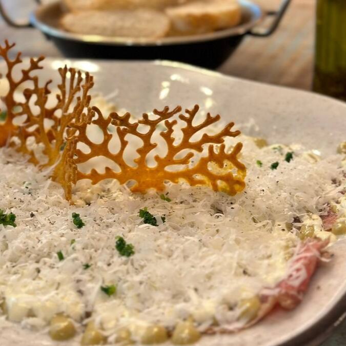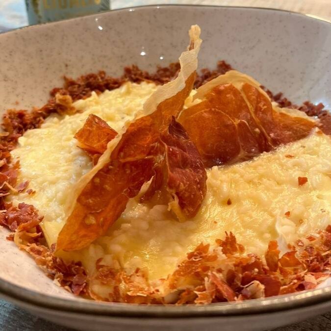 Carnaroli, mais cremoso e suntuoso, bocados de Queijo Brie e Generosa Porção de Jamon Serrano crispy.