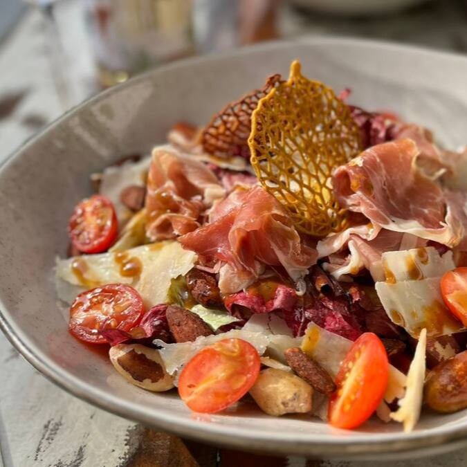 Mix de folhas frescas, acompanhada por tomates cerejas suculentos, fatias delicadas de presunto de Parma, Lascas de parmesão, finalizada com castanhas tostadas e um molho balsâmico aromático com ervas e mel.