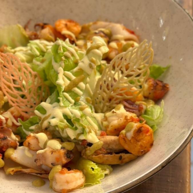 Mix de folhas de estação, tomate concasse, camarões, polvo e mariscos e molho autoral a base de alcaparras e queijo parmesão.
