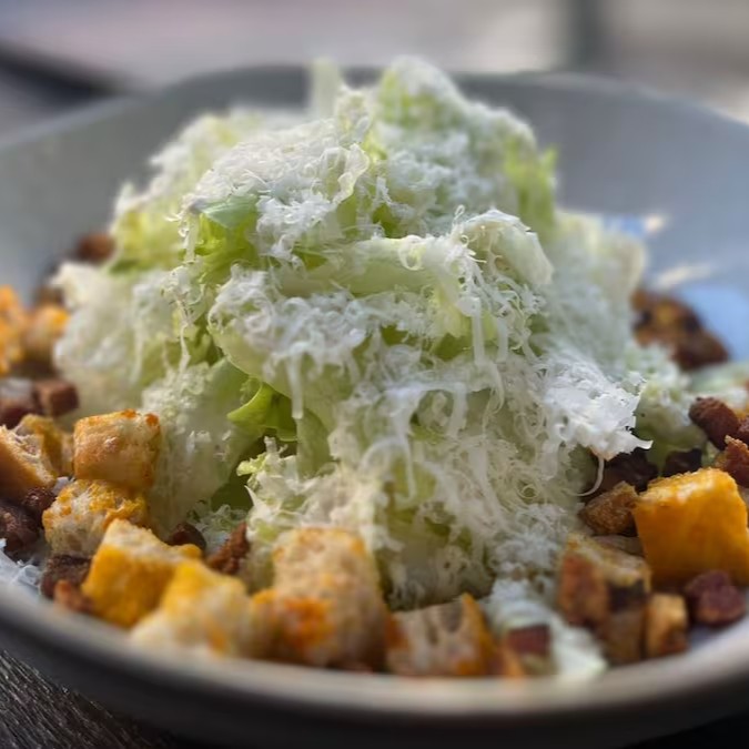 Mix de folhas selecionadas, crispy de bacon artesanal defumado, croûtons, molhos Ceasar, nuvem de parmesão.