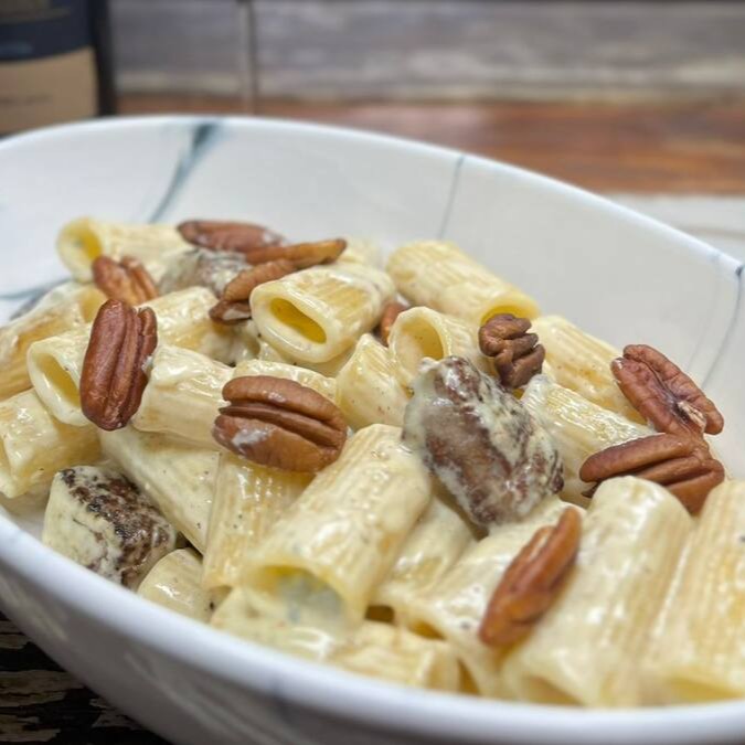 Rigatoni artesanal, envolto em um cremoso molho de gorgonzola