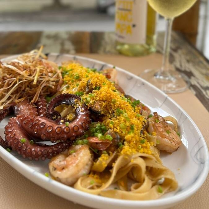 Linguine com camarões, polvo e mariscos, tudo envolvido em um delicado molho a base de vinho branco e manteiga de ervas. Finaliizado com pangrattato crocante, que adiciona uma textura irresistível neste prato.