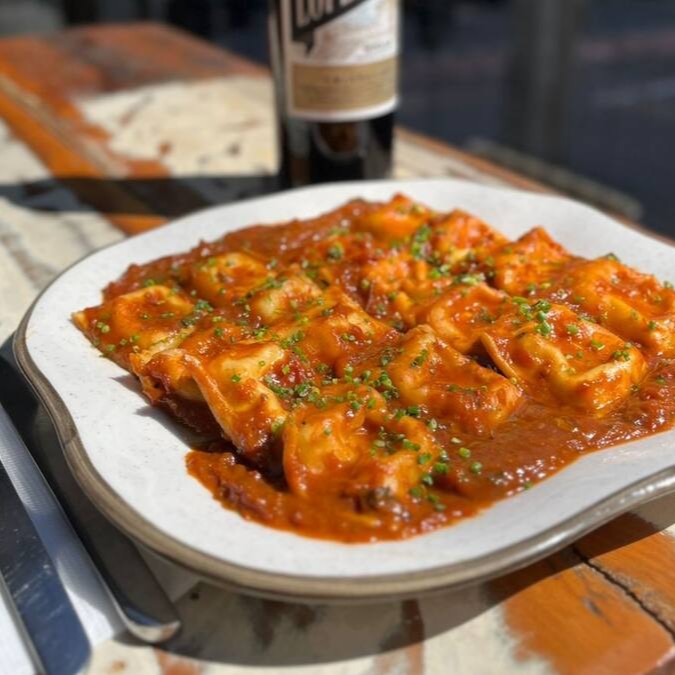 Deliciosos ravioli de queijos, guarnecido por molho pomodoro artesanal e tapenade de azeitonas verdes.