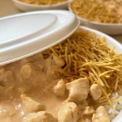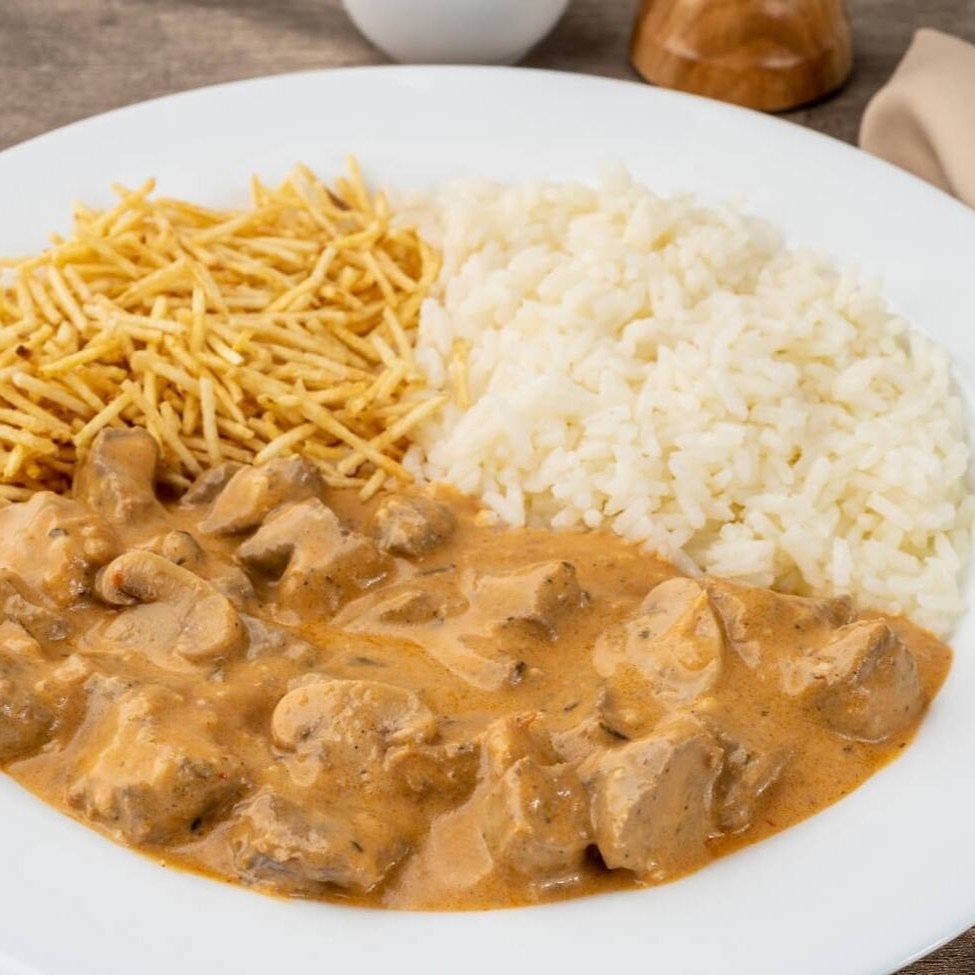 Arroz soltinho, strogonoff de frango cremoso e batata palha crocante.