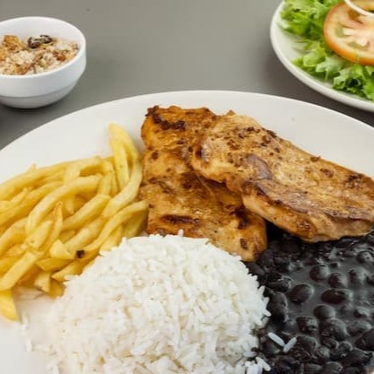 Arroz soltinho, feijão caseiro bem temperado, filé de frango grelhado no ponto certo, legumes refogados, macarrão e batata frita crocante. Uma marmita leve, completa e cheia de sabor caseiro!