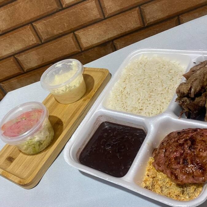 Acompanhada de um arroz soltinho, feijão encorpado, uma farofa da casa, linguiça suculenta e costela extremamente macia, feita no capricho e também acompanha uma maionese e um potinho de salada