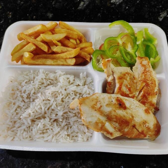 Marmita P com: Arroz, Batata frita e carne na chapa