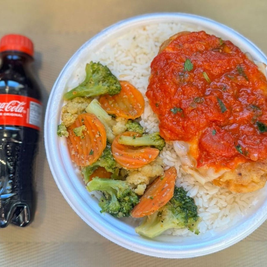 Marmita com delicioso filé de frango parmegiana (empanado na massa crocante coberto com molho de tomates e queijo) acompanhado de arroz branco e mix de legumes. Acompanha refrigerante pet Coca Cola bem gelado. Marmita indicada para 01 pessoa.