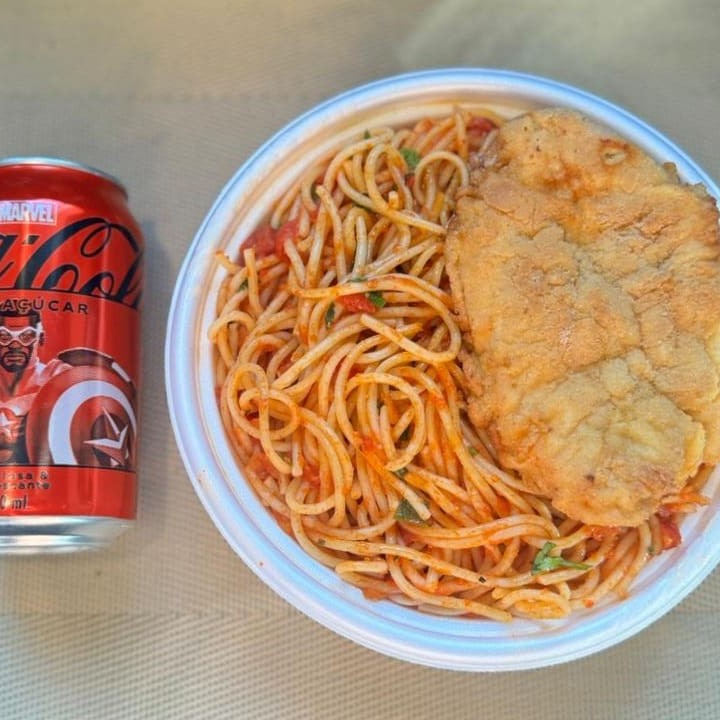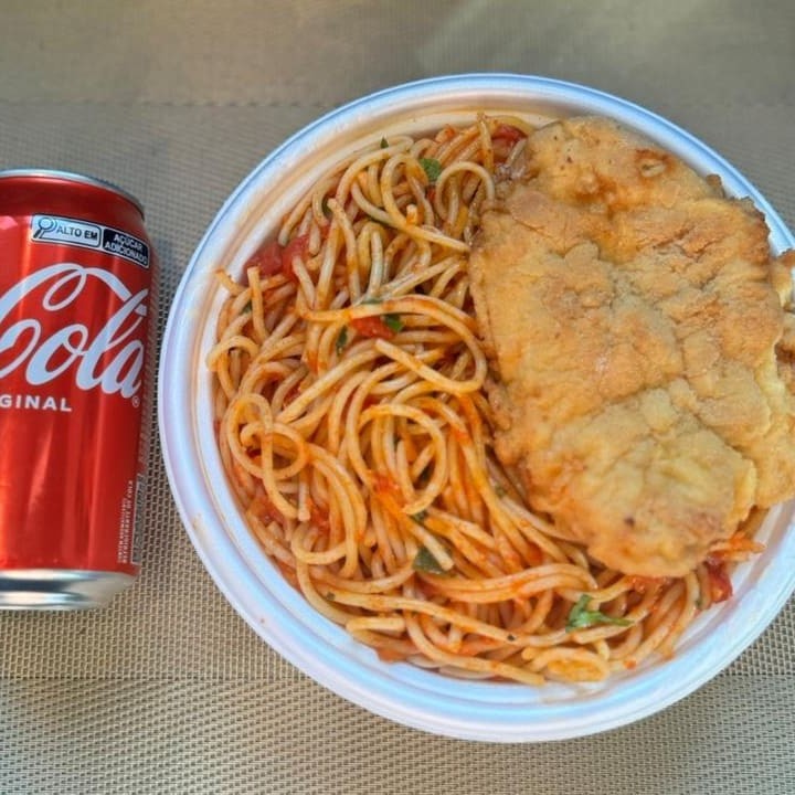 Marmita com delicioso filé de frango empanado na massa crocante acompanhado de macarrão espaguete ao molho de tomates. Acompanha refrigerante lata Coca Cola 350ml bem gelada. Marmita indicada para 01 pessoa.