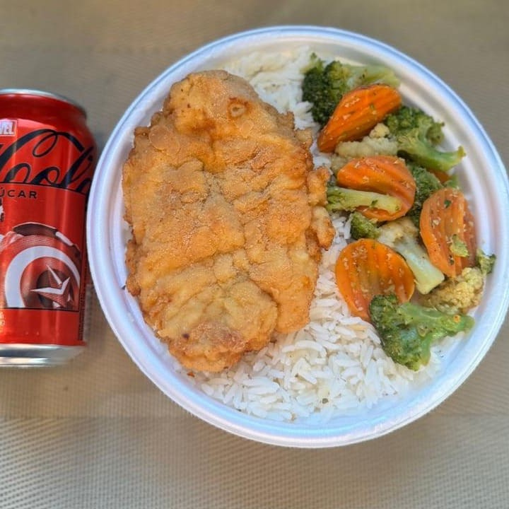 Marmita com delicioso filé de frango empanado na massa crocante acompanhado de arroz branco, feijão e mix de legumes. Acompanha refrigerante Coca Cola lata Zero sem açúcar 350ml bem gelada. Marmita indicada para 01 pessoa.