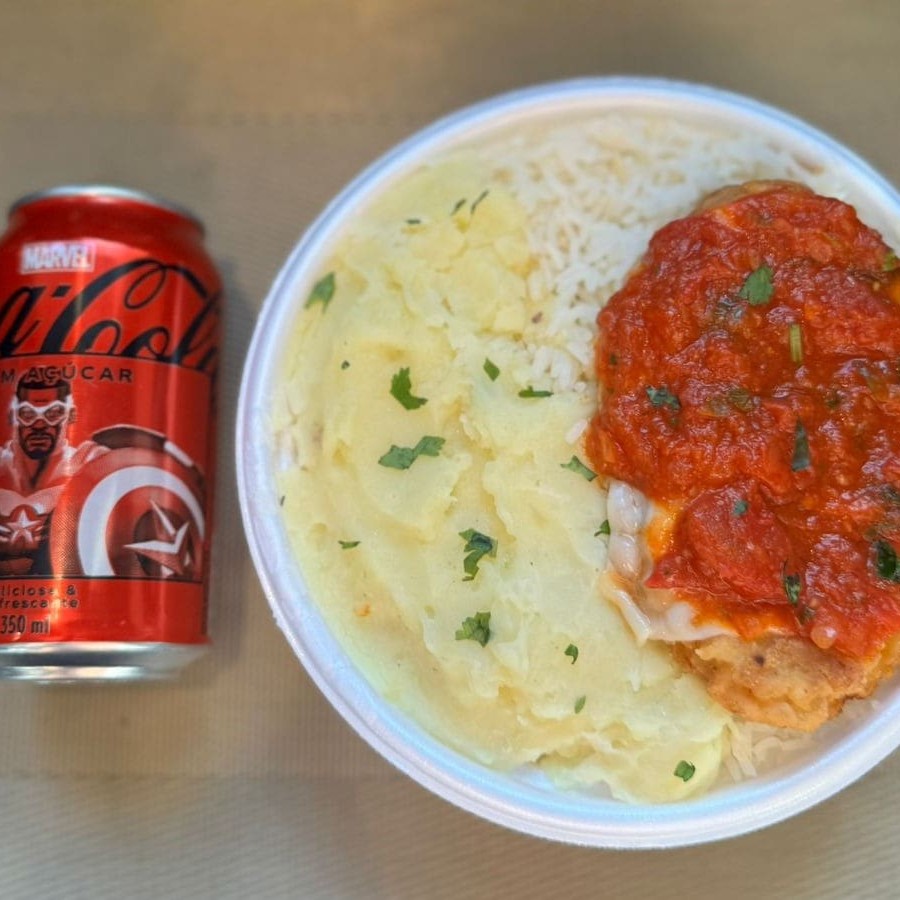 Marmita com delicioso filé de frango parmegiana (empanado na massa crocante coberto com molho de tomates e queijo) acompanhado de arroz branco e purê de batatas inglesas. Acompanha refrigerante Coca Cola lata Zero sem açúcar 350ml bem gelada. Marmita indicada para 01 pessoa.