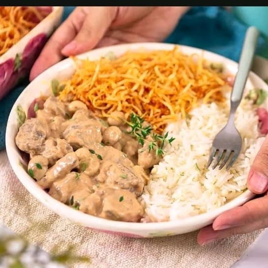 Arroz, batata palha ,estrogonofe de frango e pure de batata