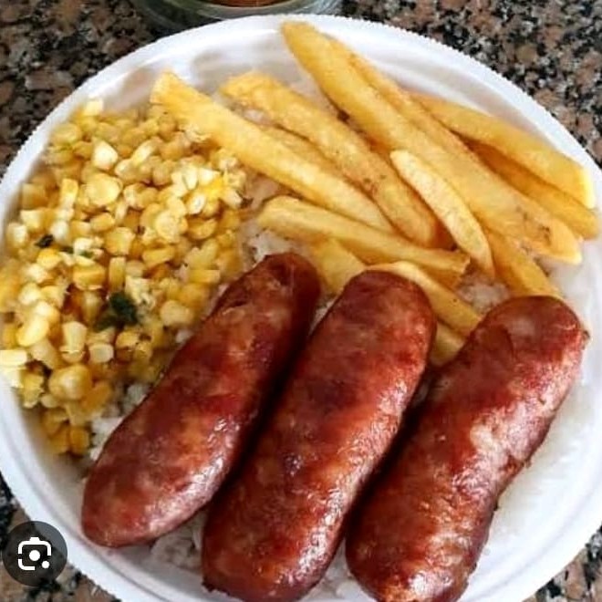Arros feijão macarrão farofa e fritas carne. Linguiça. Bovino. Frango