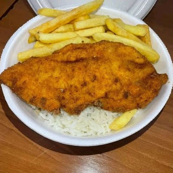 Acompanha arros feijão macarrão farofa e fritas