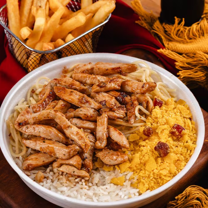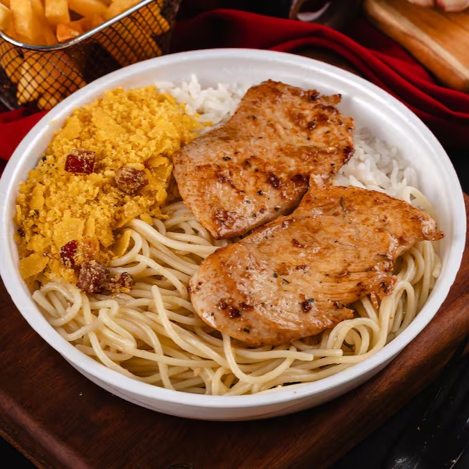 Arroz soltinho, feijão bem temperado, macarrão alho e óleo, farofa da casa, fritas e Frango Grelhado douradinho.