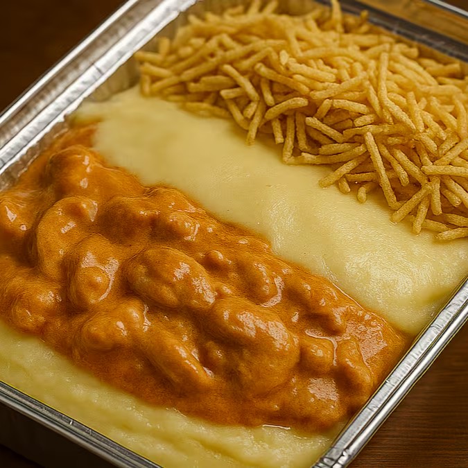 Marmita com Purê de Batata, Queijo Mussarela, Strogonoff de Frango e Batata Palha (Enviada Separada)