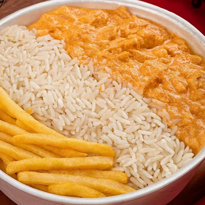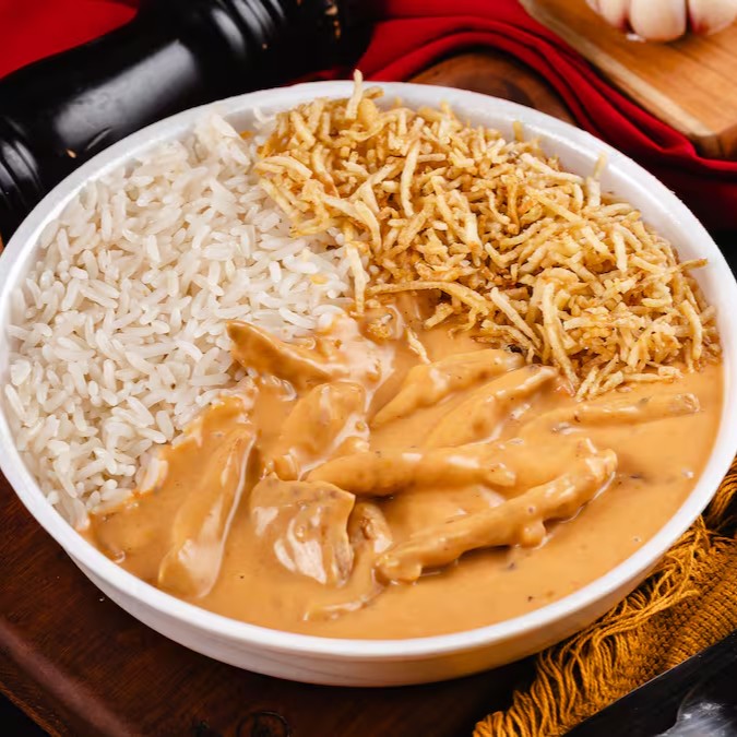 Arroz soltinho, Strogonoff de Frango cremoso, batata palha (enviada separada) ou purê de batata (escolha na observação).